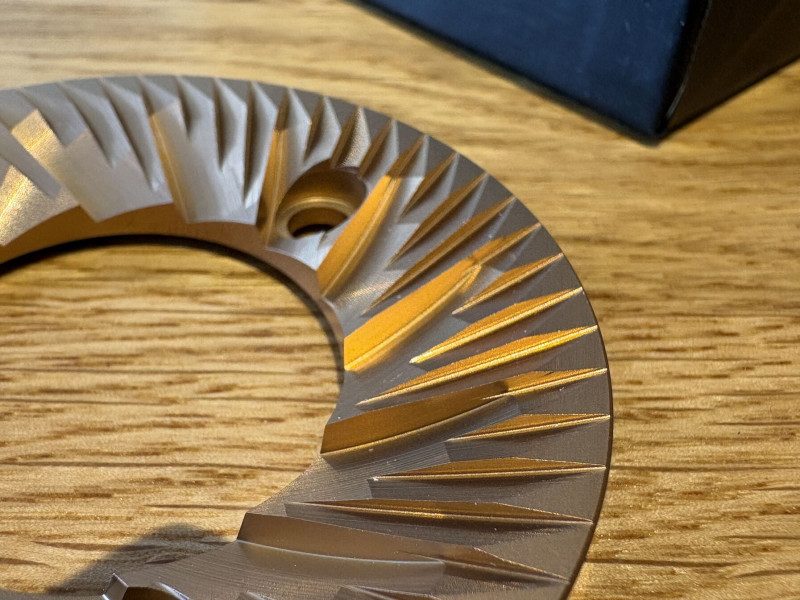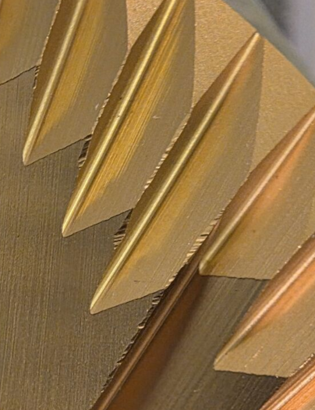 A sárga titán bevonat látszólag egyenletes, ezt a "reszelt" részt is fedi.
