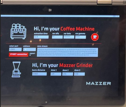A sárga mazzer mellett a nagy gép egy Rancilio classe 20. A rancilionak van saját iot megoldása connect néven. De a másik képen pedig a mazzer saját appja van, aminél a kávégép adatai között az extraction time és csillag látható a var alpha, var beta var gamma alatt, meg az, hogy valsz USBn csatlakozik a kávégép és a datastreamje is látható .