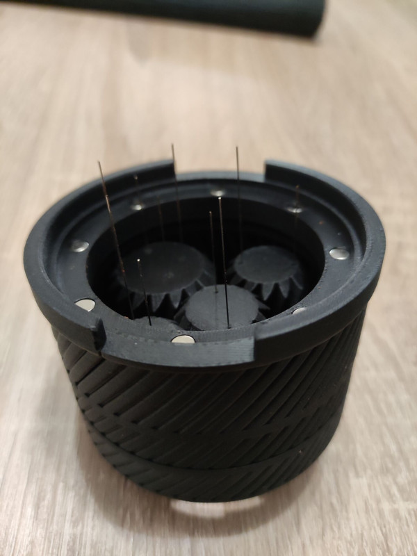 Nagyon szép egyenes felületet csinál, és nagyon jól fellazítja a KV-t a szűrőben. A Tadamm-féle egyengetőt nem használom, hanem csak tamperolom és kész. A manuális WDT-vel sosem sikerült ilyen szépre a pogi előkészítése. Nekem is hajlik néhány tű, de visszagörbítem, azt' passz. Egyébként a kis mágnesek nem igazán tartják meg a kosáron a szerkezetet, lehet jobb lenne egy ráfordítós/fülbe beakasztós alj neki. Egyébként kéne neki valami klassz nevet kitalálni, ne már Űrwdt legyen a neve. Nekem az jutott róla eszembe, hogy a három egymás melletti fogaskerék tartója pont úgy áll, mint az Orion csillagképben az Orion-öv, esetleg lehet ezzel kapcsolatos név, talán latinul is akár. Ha már a Weber változata a Holddal kapcsolatos.