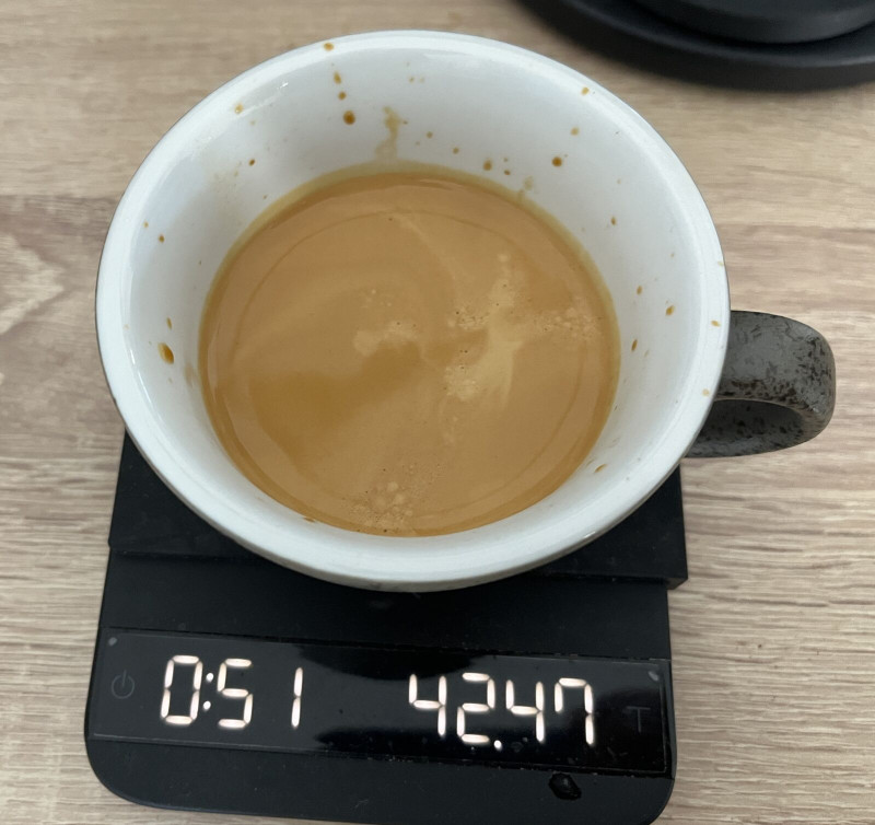 11gr, 30ml, 40mp (10mp pre-infusion). Ránézésre kicsit hígnak tűnt, és kevés volt rajta a crema, de végre olyan volt amit tej NÉLKÜL is elkortyolgattam volna.. Nem savanyította szét a szám mint egy kis citromlé, és nem jelent meg grapefruitos őrült keserű íz se.. Lehet az is segített hogy többet pihentek már a babok… (2 hét) - és először rossz irányba is mentem a kíséreltezéssel (hőfok emelés, stb.. - pedig PY oldalán is ott van a javaslat, 91 fok, tömegarány, kivonatolási idő)