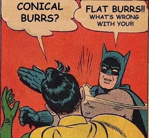 nincs ilyen különbségtétel, nagyon jó síktárcsás és kúpos darálók is vannak (és rosszabbak is). még mindig használnak roburt csúcs helyeken, ahogy van mythos one, meg ek43 is. most éppen a legtöbbre tartott őrlők síktárcsásak, de pár éve fordított volt a helyzet. a mi szintünkön meg aztán pláne van ilyen is, olyan is jó. annyi, hogy kúposból kevesebb van (ha levonod a 38 mm-es alapgépeket).