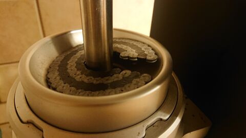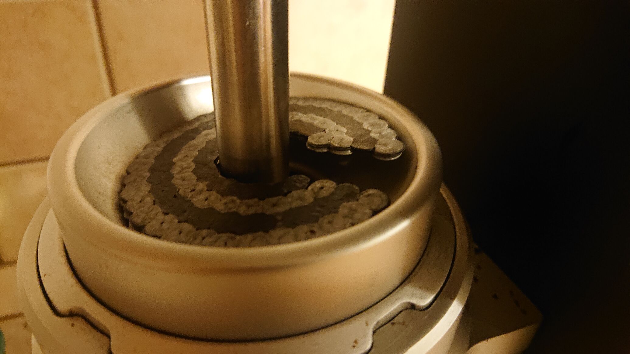 Még keresem a megfelelő szemcseméretet a dupla szűrőhöz. Mivel a legfinomabb beállÍtás sem volt elég, ezért ki kell venni minden alkalommal az örlőművet és a csavarokat kicsavarni állÍtani majd vissza. Hogy több mozgásterem legyen a tárcsán és ne kelljen mindíg szétszedni gondoltam tekerek kicsit többet amíg már-már befullada gép és onnan kezdek el visszafelé tekerni a jó lefolyásig. Sikerült szépen levinni az örlemény finomságát viszont elég lassan esett ki. Gondoltam szétszedem és kitakarítom.