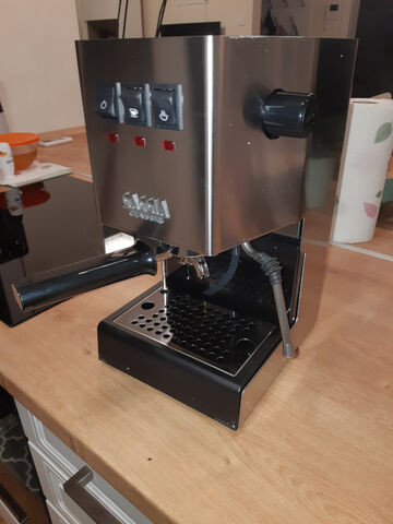 A gyári állapoton felül fél éve teljesen szétkaptam, tisztítottam. Kapott új szilikon csöveket, szűkítést a bojlerbe, pumpanyomás szabályzást. Beépítettem egy hőmérőt, ami a thermoblock hőmérsékletét méri, hogy időben lehessen indítani a gőzölést. Kapott egy 2. ipari OPV-t a pumpa után közvetlenül. Van hozzá gyári és feneketlen kar.