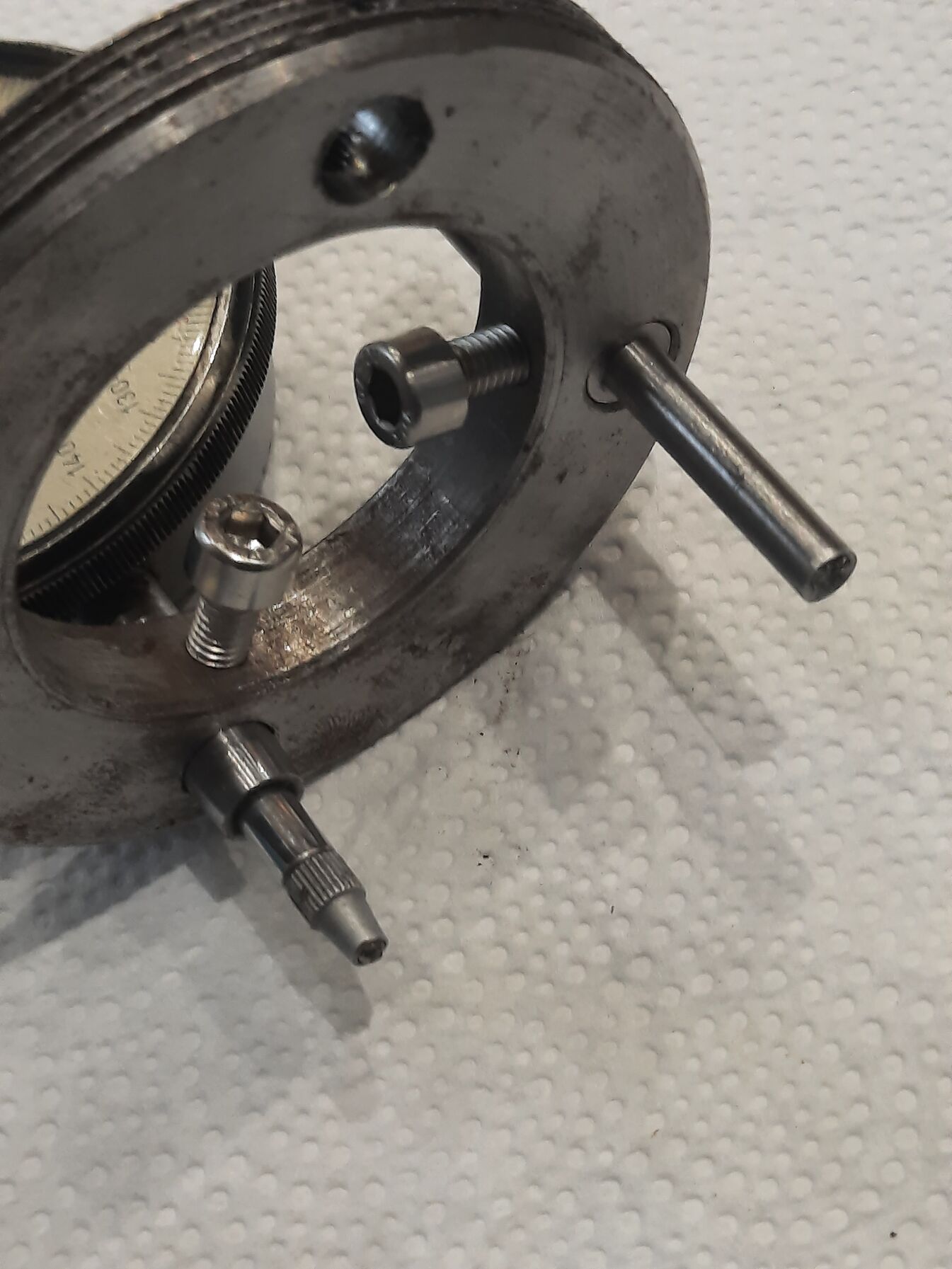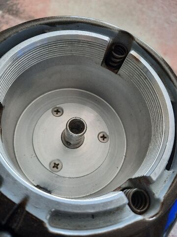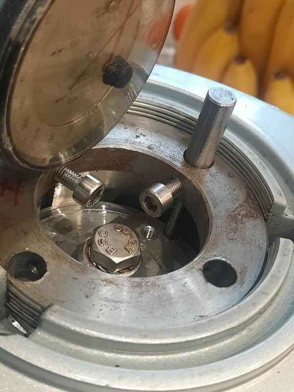 Én csináltam egy külső menetes pogácsát az állítótárcsa helyére,és a kés felfekvő felülete osztókörének megfelelően fúrtam rá lyukakat.Az egyikbe az indikátor,a masikba pedig egy speckó kés.És így szépen a helyén le lehet hántolni/gyalulni szinte nullára a forgó késtartót.Minden a menethez igazodik.