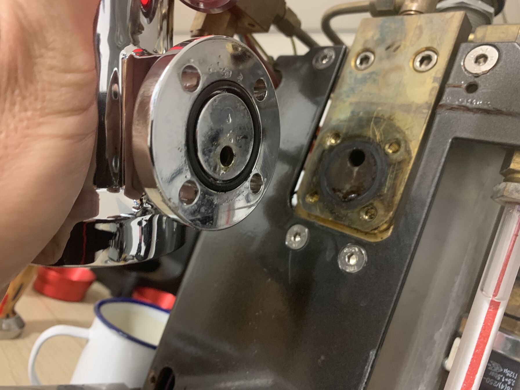 Igazából kikövetkeztethető, de a jobb oldali óra természetesen a pumpa nyomását méri, ami egy fix beállított érték (asszem szét se kell a gépet borítani hozzá, hogy módosítsd). A flow control-lal kapott órát a fejbe lehet becsavarni, ahova mi a SEP-et tűztük egy y-elosztóval és a Robot Barista órácskájával. -