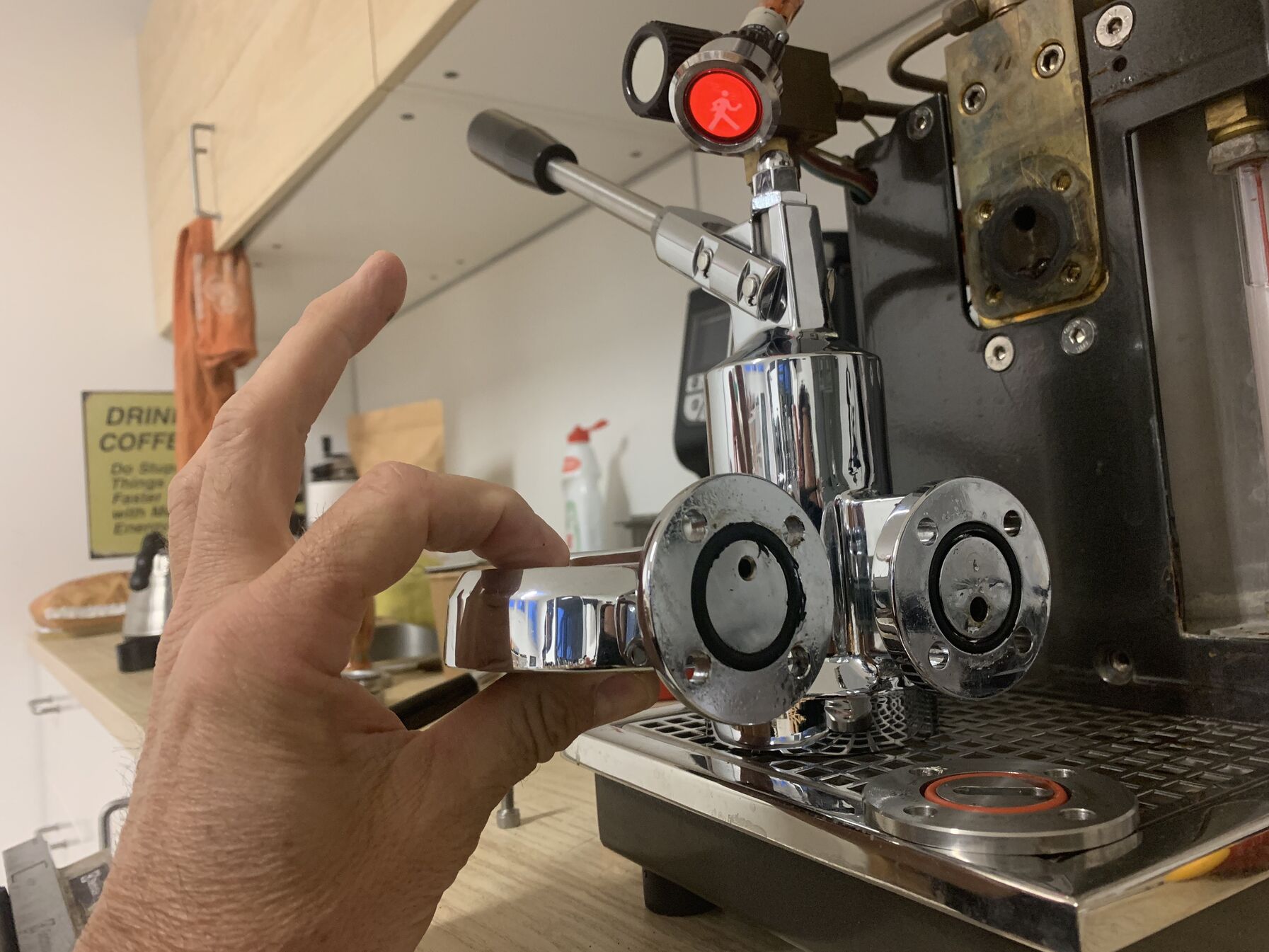 Amúgy trollkodásnak szántam, de durván jól működik. Mindössze a pumpanyomást kell visszavennem egy kicsit, épp csak annyira, hogy erősebb legyen mint a rugó, mert az nagyon tetszik, hogy "magától" feszül meg a rugó megy lefele a kar, illetve kikapcsolhatna automatikusan, ha elér egy limitet. Sokkal alaposabb az előáztatás, mint bojlernyomáson és épp ezért totál szokatlan hosszú shot-ok összehozhatók a Creminávaé Fellini nélkül. Szeretem. Kíváncsi vagyok, mit lép az Olympia