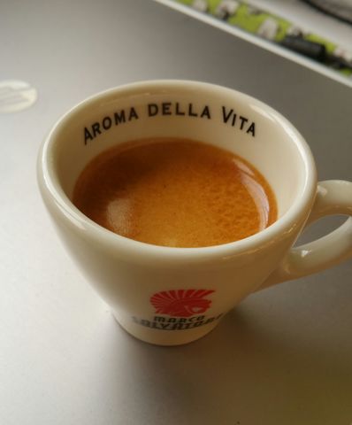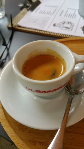 A felszolgáló azt mondta, hogy Hausbrandt espresso kávéból készítik. Hogy mikori pörkölés, azt nem tudta. Tömény keserű kávé volt, amit csak a hozzáadott tejszínnel és cukorral tudtam meginni.