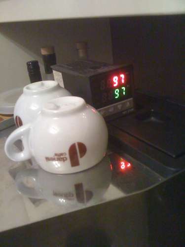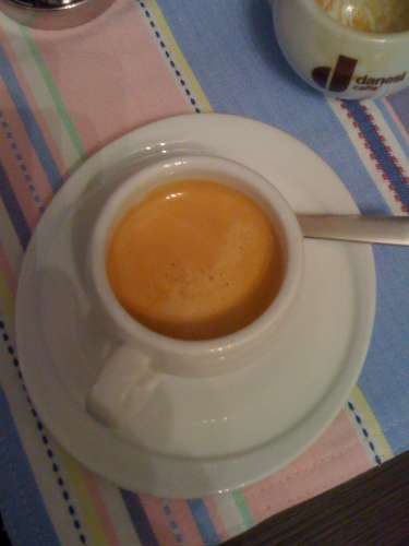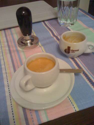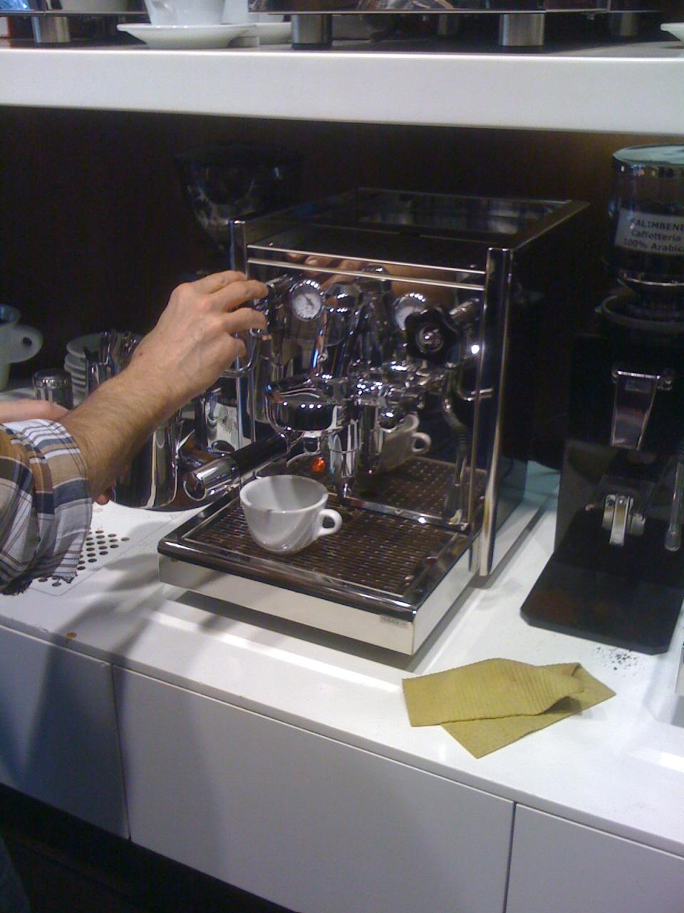 Szombaton Bécsben voltunk, és a Taste.it-nél kávéztunk, ami ezen a napon 3-ig van nyitva. Egy ECM rotorszivattyús gépen főzött nekünk az ember (az, akinek csak a keze látszik) egy nápolyi brand kávéjából két ristretto-t és egy cappuccino-t. A nevét nem jegyeztem meg, de nem is fontos, ezer ilyen van, és mindegyik elég jó.