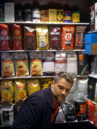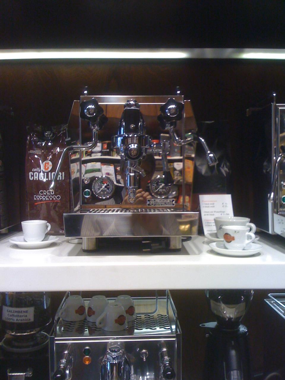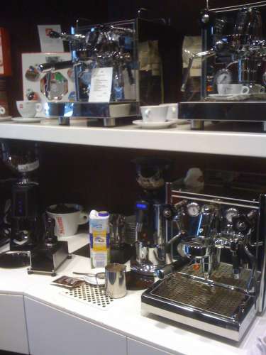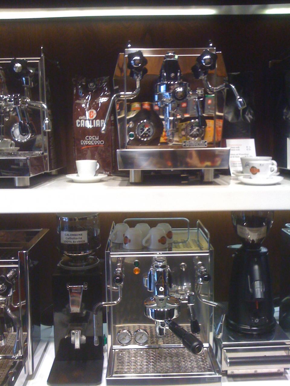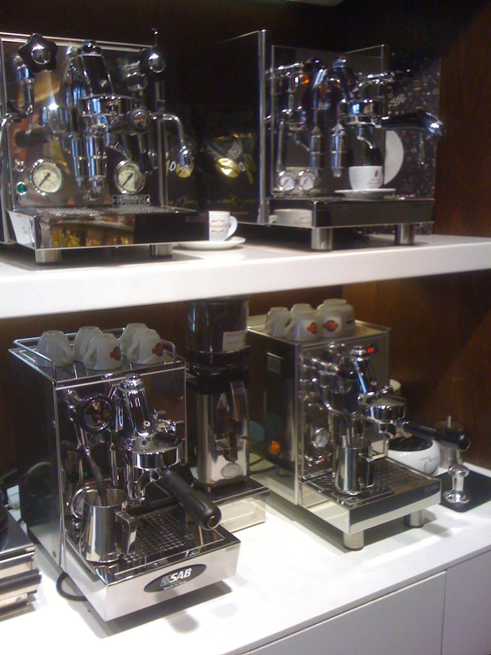 A bolt kínálatában megtalálható minden valamire való kávéfőző (az egy LM-n kívül), a vezérürü természetesen a Faema. (Ezt most éppen nem láttunk.) A legismertebb olasz brand-ek kávéitól a kiegészítőkig, sok minden (kaptam egy ECM tampert