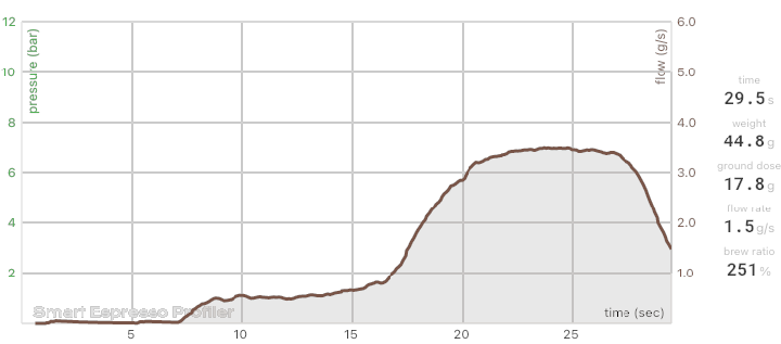 0.2 alá nem megyek a Lagommal finomságban, de inkább 0,25-0,3. 1-2 közötti sebesség (ezzel kvázi megvalósul a slow feed). 99-100 fokos, 80 gramm vízzel felöntöm a 17,5-18 gramm őrleményt. Előáztatásnál nem mindig mozdul ki a nyomásmérő, nem ritka az 1 bar vagy az alatti érték. Ebből kap ízlés szerint 15-20 másodpercet, aztán ami a csövön kifér 5-8 mp alatt lejön a kávé, 4-7 bar körüli csúccsal, max 1-2 pillanatra nyal bele a csúcsértékbe.