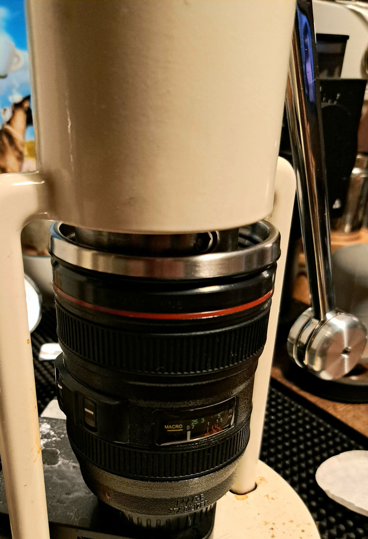 Hideg vizet teszek bele és mikrózom, egyszer 2:30 percig, amíg a kávét készítem elő/félig leőrlöm, majd várok kb. 30 másodpercet, hogy a hő valamelyest kiegyenlítődjön, majd adok neki még 40 mp-et. Így a végén forr, de mivel thermo pohár, meg tudom fogni szabad kézzel és a képen látható módon megy a dugattyú alá kb. 40 másodpercre (addig elő wdt-zem a C40 őrleményét, beteszem a mikróba a 2. espresso poharat 2 ujjnyi vízzel, aminek beállítok 25 másodpercet, de még nem indítom el). Folyamatos a workflow, nem érzem tehernek, leírva/olvasva nyilván bonyolultnak érződhet.