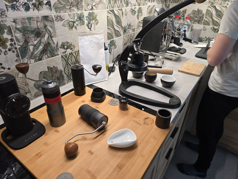 Kézi daráló grind-off, espresso témára. Természetesen majd ismételni kell, mert a Jmax nincs bejáratva, a Pietro-ban meg a probrewing szett volt.