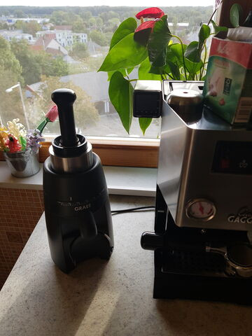 A Graef 702 őrlő problémája a garat, és a garat előtti rész. Bármit teszek, rátapad a falra az őrlemény. Van úgy, hogy hiába paskolom, ütögetem, nem jön ki. Majd megiszom a kávét, visszamegyek rendet rakni, és alig érek az őrlőhöz, a kávé leválik az őrlő faláról, és az asztalon landol. Hogy a statikus feltöltődés miatt van, vagy mástól, azt nem tudom.