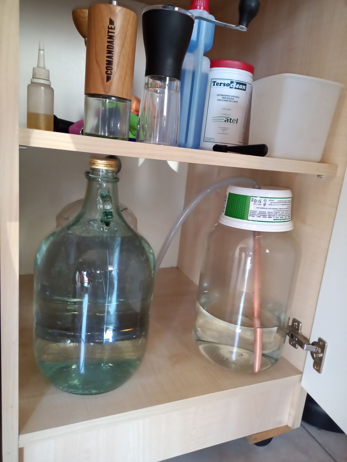 Az üvegen nem vettem észre, de amikor egyszer azt láttam, hogy a bekevert sók fátyolos üledéket képeztek az üveg alján, azóta kéthetente öblítem az üveget is. Kb akkor szoktam a csepptálcáról lefolyó vizet és az OPV által eldobott vizet gyűjtő másik kannát is öblíteni. Algásodás nincs, mert az üvegek lent a szekrény alsó polcán vannak. Zárt ajtók mögött