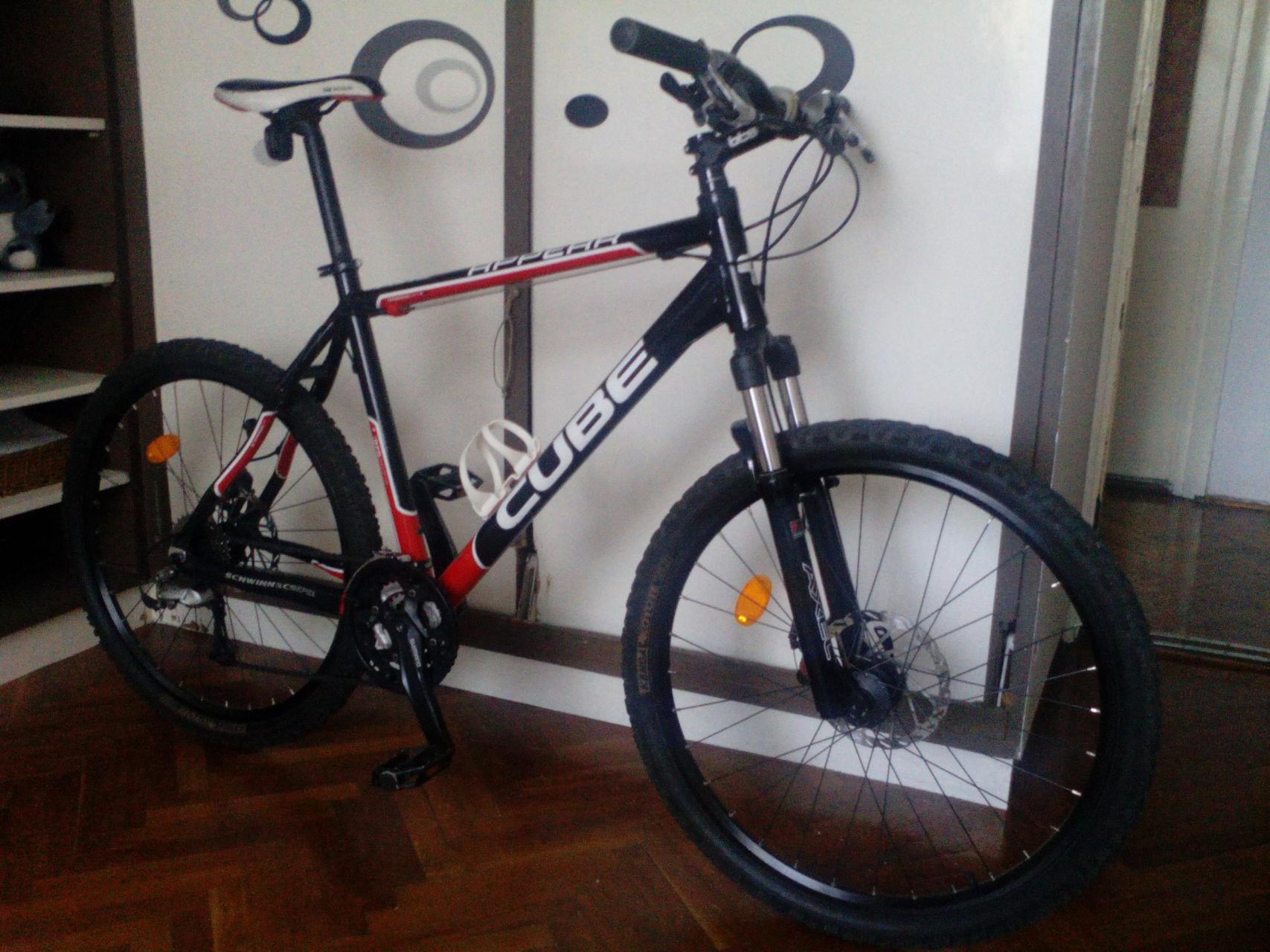 Cube Appear, XT váltó hátul, elöl deore, Shimano octalink hajtómű, 3x9es rendszer SLX váltókarok, Manitou Axel villa, Avid BB7 fékek 180as tárcsákkal