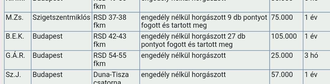 B.E.K. Budapest RSD 42-43 fkm engedély nélkül horgászott 27 db pontyot fogott és tartott meg 105.000 1 évÖrök eltiltást adtam volna neki.