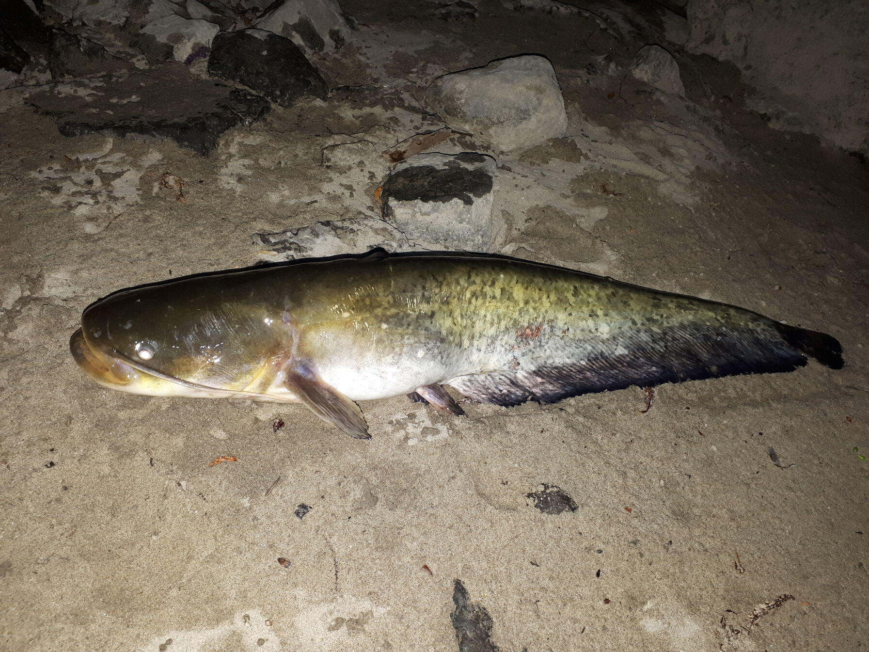 Fél tiz körül ütemesen cibálni kezdte valami a spiccet, bevágás után éreztem, hogy van egy kisebb vendég a horog végén. Nagy volt az örömöm, amikor a fejlámpa fényénél megpillantottam a vizben tekergődző kölyökharcsát. 45 centis kis apróság, be mohón beszippantotta a gilisztacsokrot. Az idei első harcsám, a Dunától pont azt kaptam, amit szerettem volta, egy szép vizparti estét egy szép halacskával: [kép]