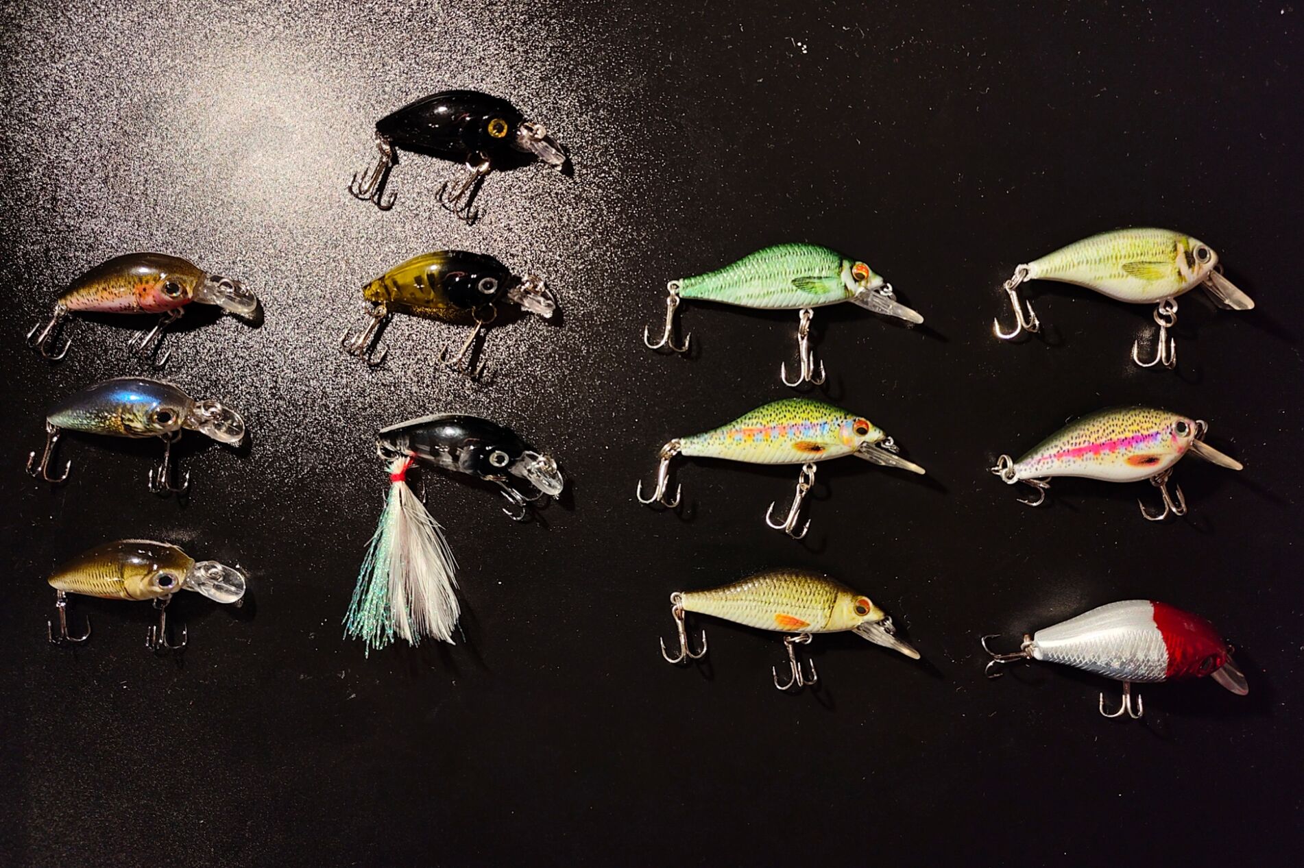 Fent az abszolút bajnok fekete (3.5 centis test, kb. 4-5 gramm). Bal szélső oszlop új, legalábbis annak hittem, de igazából ugyanaz mint a fekete, csak szebb, minőségibb festéssel. Valószínűleg működni fognak. Második oszlop eddig is volt, használtam, bevált cuccok. Harmadik oszlip újdonság, nagyon szép festés, a méret is abszolút domis (4.5 cm / 6-7 gramm), alig várom hogy kipróbáljam őket, terelő nyelv alapján picit mélyebbre törő változatnak tűnnek, de inkább a mozgásuk érdekel. A jobb szélső oszlop felső kettő tagja is új, ugyanaz a méret mint az előző, csak ducibb crank forma. Jobb alsó kakukktojás, eddig is megvolt, ezzel a színnel konkrétan még nem fogtam domit, de a forma működik.