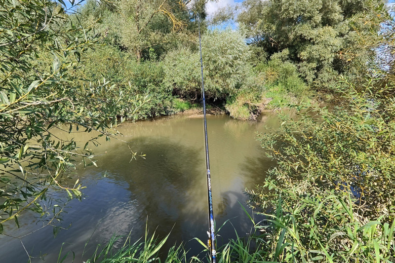 A fenti hely jobb szélén látható fa mögött volt egy szakadt partoldal, nehezen le tudtam mászni "félmagasságig", ahonnan meg tudtam dobni a saját oldalalom a kanyar külső ívét. Magas, szakadt part, alatta mély víz, fölé lógó bokrok, igazán sokat sejtető hely volt... Beesett a wobbi, azonnal nagy ráindulás, tolóhullám, de elvétette! Pár méter után viszont durr, odavágott, és meg is akadt a fejes!