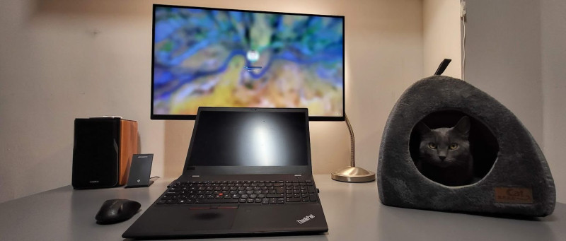 Thinkpad P52s, Samsung M7 32" 4K monitor, Edifier hangfal, macska. -