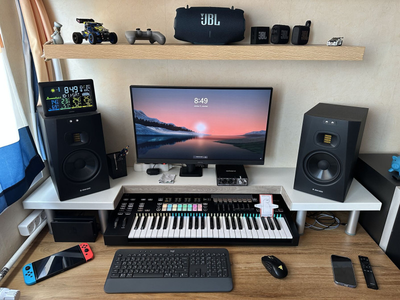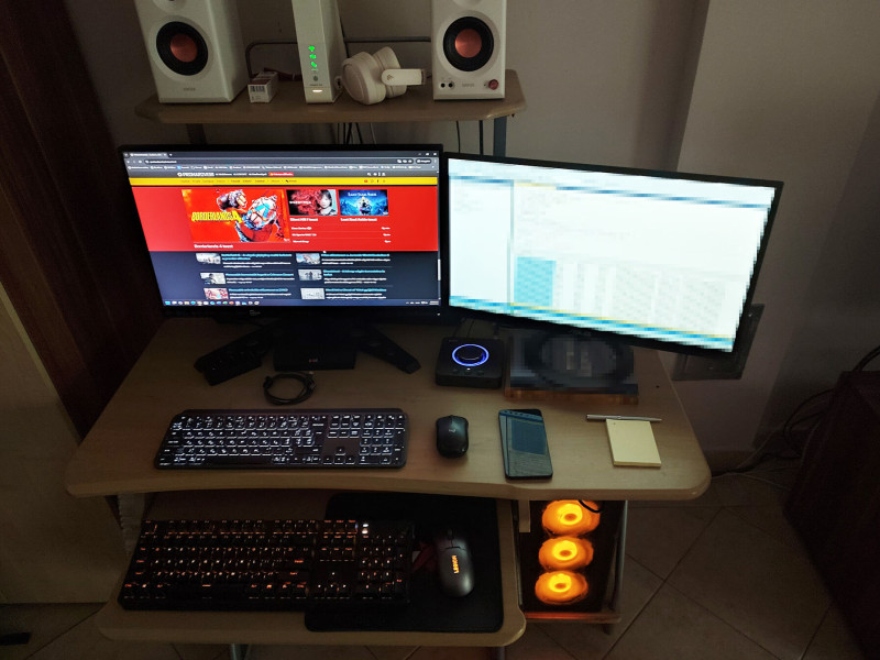 Hát igen... sokat matekoztam, amíg kitaláltam, hogy hogyan férjenek el ekkora helyen (nem véletlen, hogy mindegyik bill. és egér wireless). Az MR3 meglepően jól szól, bár még nincs rendesen bejáratva mert elég friss beszerzés, de még a feleségem is megjegyezte, hogy milyen tiszta a hangzása, pedig ő saját bevallása szerint is "botfülű".