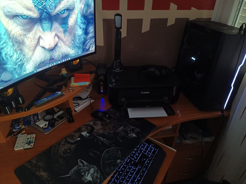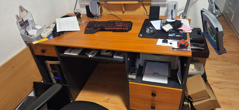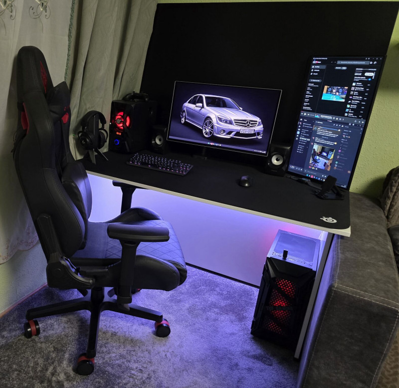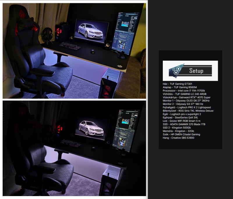 Sima fekete furnérlap, amire 3d-s tapéta volt a terv, vagyis az lesz majd, de már lakásfelújítás után kerül csak sor, mert át lesz alakítva az egész asztal. Nem ilyen, de valami hasonló. Egyébként a sötét háttér nagyon jót tesz a monitoron megjelenő képnek, mondjuk alapból az oled nagyon szép, de ha nincs mögötte zavaró háttér, még jobb.