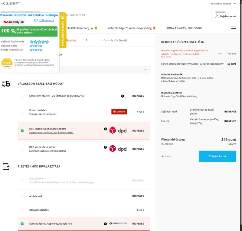 Közben találtam egy szlovák webshopban egy kezdeti akciót. Ott a 12/256-os 399 euró helyett neo60 kóddal most 349 euro kb 134 ezer forint. Adnak hozzá töltőt is. Párkányba több DPD-s vagy Alzás automatába kiszállítják ingyen. Ha valakinek megéri, akkor ez egy egész jó lehetőség. https://www.najmobily.sk/motorola-edge-60-neo-12-256/