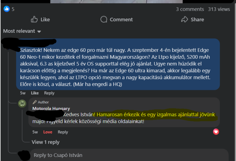 Azert azt nezni kell, hogy ennek 6,36 colos a kijelzoje, azaz mai viszonylatban kicsi. Kb. akkora, mint az S25, Xiaomi 15 es Pixel 10. IPhonenal egy hangyanyival nagyobb. 200 alatt ujonnan egy "kis" kijelzos telefon eleg jo szerintem. Igaz nem csucs, kozepkategorias minden porcikajaban, de ha valakinek uj telefon kell, akkor ez jo lesz. Reszemrol edge 40 utan tobb Motot sosem veszek mar, mert botranyos, kiabrandito, siralmas a szoftveres tamogatas. Plusz hiaba lesz ez 200 alatt varhatoan, elobb vennek hasznalt S24-et (van is), Pixel 9-et vagy iPhone 14 prot ennyi penzert, mint ezt.