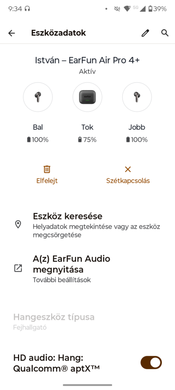 Hátrány, de ez nagy eséllyel keveseknek lesz bosszúság. A kocsiban az autós fejegységhez kapcsolódva szakadozik a bluetooth kapcsolat. Nem másodpercenként, de éppen elégszer ahhoz, hogy elég zavaró legyen. Bluetooth fülessel ilyen gond nincs. LDAC és AptX megy.Az LE-audiót felajánlja és be is kapcsolja, de nem visz át hangot. Ez lehet, csak az Earfun füleseket érinti, mert a dedikált abban konkrétan említik, hogy csak bizonyos Samsung és Google Pixel modellekkel fog működni.