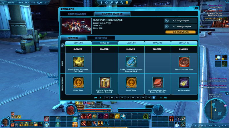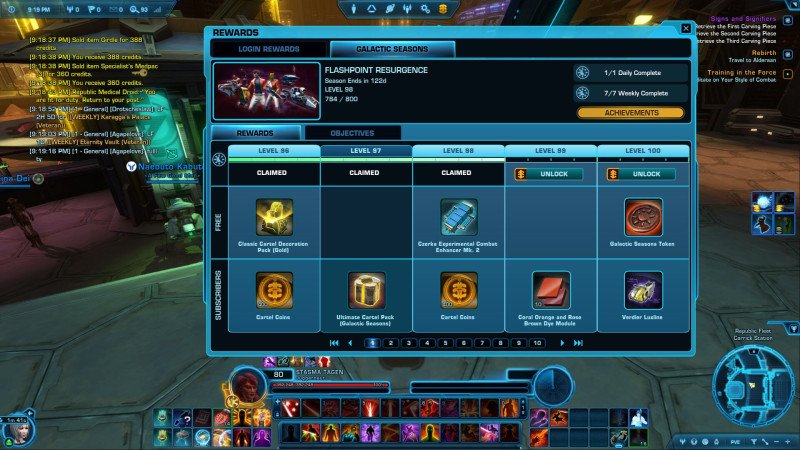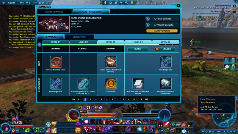 Upon logging in on the fourth day, players will receive 6 of these tokens. They can be exchanged at a vendor on the Fleet for a variety of rewards such as previously retired emotes, pets, and toys, 340 Rakata gear, experience boosts, supply crates, and a droid customization that is inspired by K-2SO from the Disney+ series Andor™. Below is a complete list of all the rewards that can be found on the vendor." -