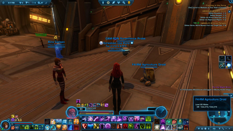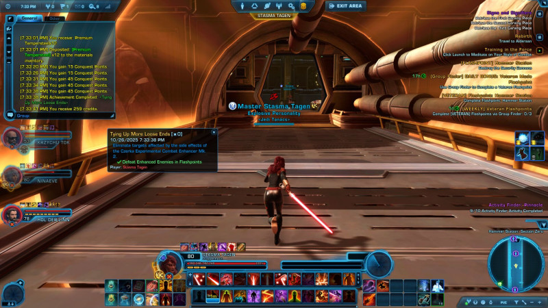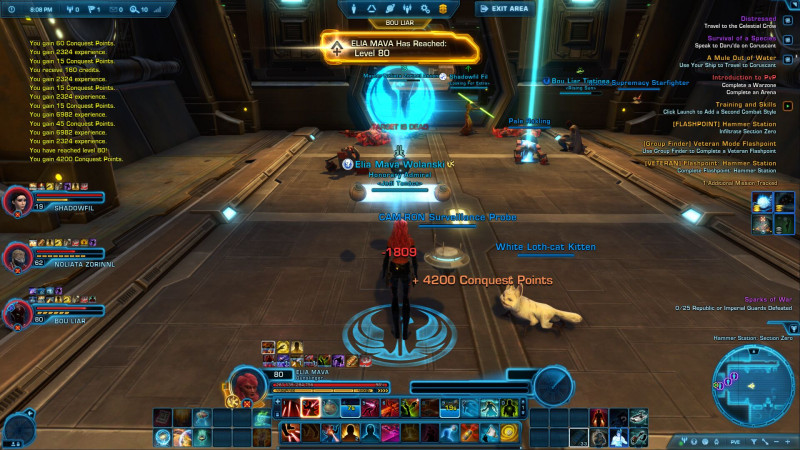 Tegnap én is játszottam kicsit. Én még csak chapter 1-ben vagyok, JK karakterrel. Általában a story küldetések, meg a mellékküldetések eléggé könnyűnek tűnnek, a karakterem magasabb szintű, mint ami az adott küldetéshez kellene. Tegnap azonan elkeveredtem egy Flashpoint küldetésre (asszem Maelstorm prison?) ahol Revant kellett kiszabadítani. Hát ez eléggé combos volt, csak azért sikerült megcsinálni, mert a harci droid, akit a küldetés elején kaptam, brutál erős volt, szerintem vagy 1 millió sebzést benyelt, és aprított rendesen. Itt nem éreztem úgy, hogy sok esélyem lenne nélküle, az én sebzésemmel a 100000 hp-s szörny bosst, az egyszerre támadó 3 sithet, vagy a végén a moffot biztos nem tudtam volna lenyomni. Fura módon a társam (Kirát szoktam vinni) ott volt a pályán, de meg se mozdult, azt mondta a játék, hogy unavailable. Nem tudom, ez mennyire normális, esetleg én csinálok valami rosszul.