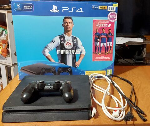PlayStation 4 Slim 1TB-os konzol (Jet Black CUH-2216B szériás), dobozában (FIFA 19 játék és plusz kontroller nélkül) a HDMI kábel 3 méteres High Speedesre cserélve.
