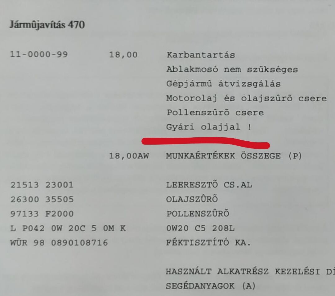 Felhívtam őket időpont foglalas miatt es telefonban kertem, hogy gyári olaj menjen bele, illetve csereljenek pollenszurot is. A szerviz lapra ezeket rairtak, kulon kiemelve, hogy gyari olajjal kell a csere.