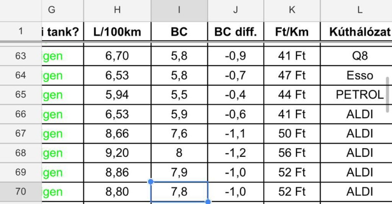 Ne csak a szepet mutogassuk. Utolso 4 tankolasom az elmult 2 honapbol. 1.5Tgdi Kia ceed, dct valtos. Egyreszt stabil 1 litert csal lefele a BC, masreszt Bp kornyeken hidegben, dugozgatva, rovid tavokon is hasznalva siman nyeli a 9 litert szazon. Felette levo adatok olasz őszelésből szarmaznak, autopalyan kulturaltan fogyaszt.