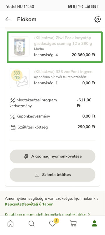 Írtam az ügyfélszolgálatnak, vissza is utalták a 3%-nyi összeget a rendelésből, de azóta sem viszi pl a mostani 10% száraztápos kupon mellé.