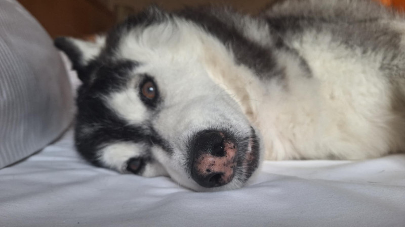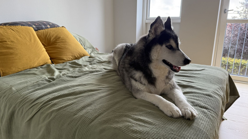 Husky az ágyon csendélet.