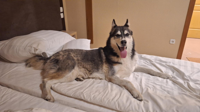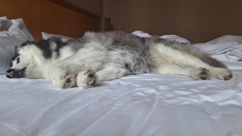 Úton az új kutyusért - husky a hotelszobában csendélet. Reggel azért nem akart felkelni.