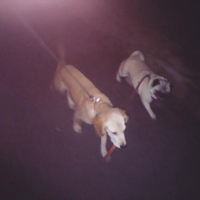 A hétvégére vigyázunk egy mopsz kutyusra, reggel én sétáltattam Marcit, Marci pedig Luca pórázát fogta