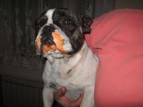 Majd keresek képet Eve-ről, van egy tök poén kép, mikor párom felemelte vacsi után, a tápjára öntöttünk egy kis paradicsomos szósz maradékot, tiszta vérbulldog feje van...