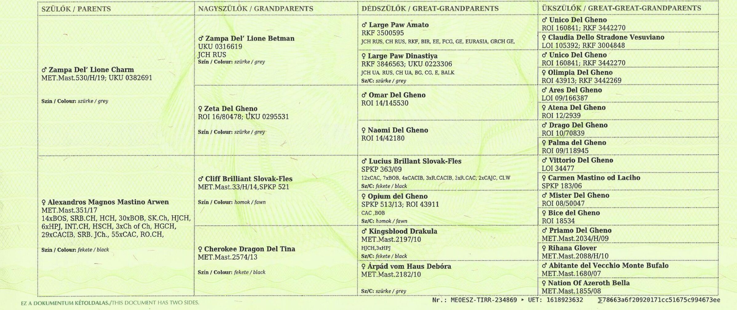 Az anyja ICH, 4 ország championja, idei világkiállításon Brno-ban champion osztály kitűnő 1 helyezettje.Szuka testvére ugyanitt kölyök világgyőztes lett.