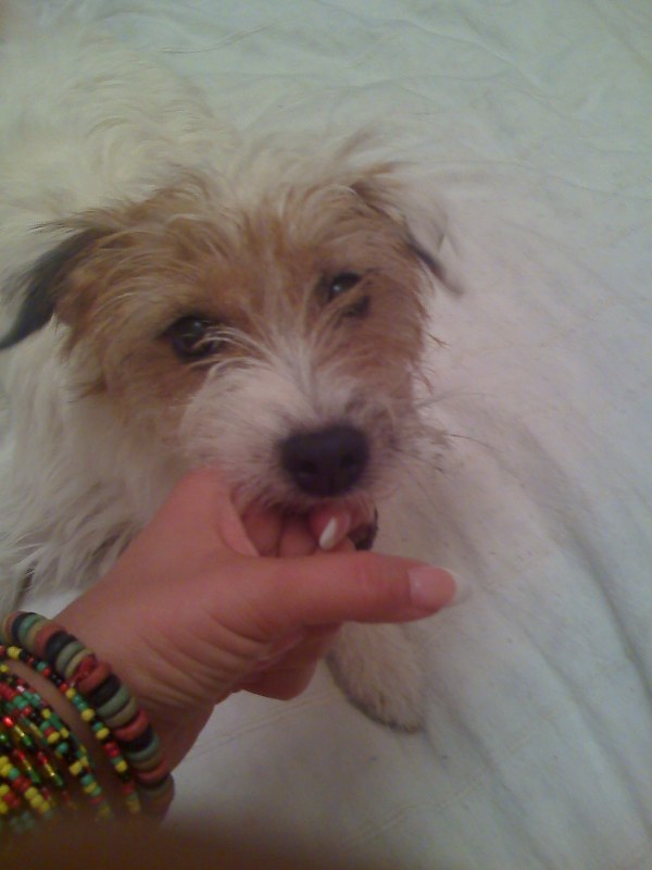 Na ez bukott meg nálunk csúful. Linzer - már elnézést a kifejezésért - baszott rá, hogy ráz a kaja. Neki kellett a virsli, úgyhogy leszedte. Végül megtanulta, de ahhoz az kellett, hogy különböző emberek próbáljanak neki kaját adni úgy, hogy ő nem tudta, hogy látom. Amikor el akarta fogadni, repült a kulcscsomó vagy a lánc, lesből. Aztán megtanulta, hogy csak akkor van evés, amikor én mondom, hogy 'Tiéd'. Arwennel már nem volt ilyen gond, nála csak a dobálós módszert alkalmaztuk és bejött.
