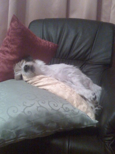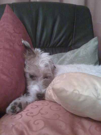 Arwenem ilyen eszement. Előfordult, hogy a negyedik lépcsőfokról úgy fejreesett, azt hittem, kitörte a nyakát. De nem, megrázta magát és kalimpált tovább. Rendszeresen kifarol a parkettán/kövön és elesik, lefejeli a szék- vagy asztallábat, lendületből ugrana ölbe az üvegasztal alól és koppan akkorát mint a büdösbogár. Tényleg van abban valami, hogy a kutyák hasonlítanak a gazdájukra.