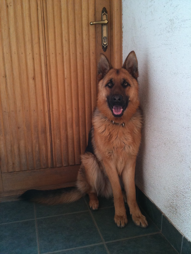 De amíg nem megy ki senki,addig nincs baj, csak szól hogy jött valaki, de amint kimegy, olyan vicsorgásba meg ugrálásba kezd, hogy nem lehet vele mit kezdeni. Úgy ég a pofánk a postás előtt... -