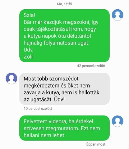 Útközben kiderült, hogy talán nem is az ő kutyája, hanem a velük szemközti szomszédé az aki csapta a zajt. Vagy is-is. A fenet tudja, de hál isten megszűnt az a folytonos több órás kutyaugatás.