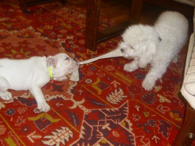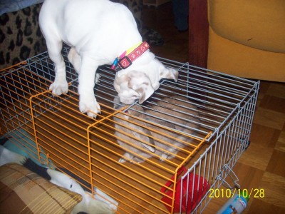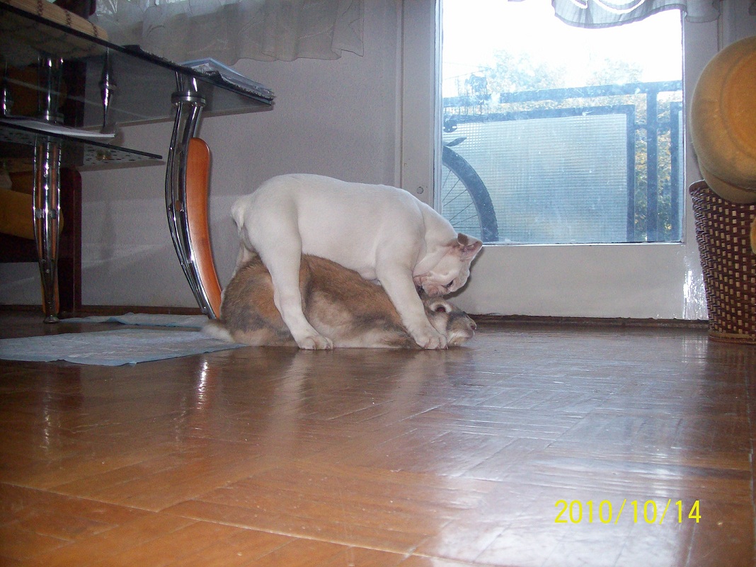 Péntek óta van itthon hellyel közzel még megy a csata ki legyen a feljebb a rangsorba szvsz Marci kutyánknak nem sok esélye van a "hölggyel" szemben mert már most nehezebb a buldog mit a fehér pamacs megy neki leszegett fejjel mint a faltörő kos aztán meg sunyin alulról elkapja a mellén vagy a nyakán a szőrt. -