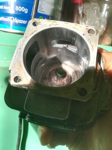 Stihl esetben igaz lehet, mert ferdén szív be. Itt azonban az látszik mindkét gépnél, hogy a kipu oldalon benézek és látok egy jobboldalon erősebben megkopott, esetleg csíkos felületet, bal oldalon pedig újszerű eszterganyomos dugattyú felület van, mintha sosem ért volna a hengerhez.