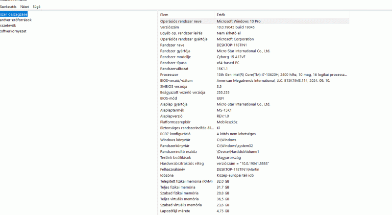 adott egy tavaly októberben vásárolt telekomos Msi Cyborg 15 a13vf.