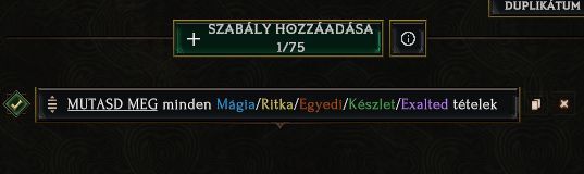 Pl: egy ritka cucc esett, amin van egy 5-os. Ha csak a rejtes van, nem fogod latni. Ha a rejtos fole beraksz egy olyat, hogy mutasson minden 5 vagy nagyobb affix-est, akkor annak ellenere, hogy ritka, latni fogod, mert a mutatos nagyobb prioritasu, mint a rejtes.