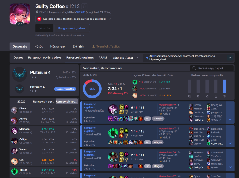 Igen, de ne az egész 300 meccses rostert nézd, mert sokat játszottam másokkal is együtt stb. A konkrét climb jellege a dolognak most pár napja indult el G4-ből P4-ig akartam felmenni, ennek a szakasznak volt 85% winrétje. A 6 nappal korábbi 2db Seraphine meccstől indult, utána jött sok Thresh meccs. És amúgy úgy, hogy Thresh soha életemben nem játszottam korábban, mondom rápróbálok és annyira működött, hogy 91% winratem van vele jelenleg, csak 1 meccset buktam vele.