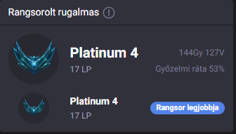 Most persze mondhatod, hogy feljebb tolódott minden, de erre kellene valami bizonyíték is. Mondjuk volt silver/gold játékosok konkrét idézőnévvel, hogy most vajon ők is annyival feljebb vannak e? Mert ebben nem vagyok azért annyira biztos. Szerintem nagyon sokan ugyan ott vannak, hol a rendszerváltás előtt voltak, ugyanabban a divben.Itt látható a rank distribution, ez alapján a játékosok 13% van platban, ez kevesebb mint ahány % az alatta lévő tierekben van. Ha az lenne, amit állítasz, hogy minden korábbi gold játékos platba került volna, akkor ennek minimum 20-25%-nak kellene lennie, mert a playerbase fixen 20-25% goldos volt mindig is és akkor beleszámoltam már azt is, hogy platból is mentek fel playerek emeraldba ugyebár. (de oda diából is esnek vissza, szóval az nem mondható, hogy mind volt platos játékos lenne)